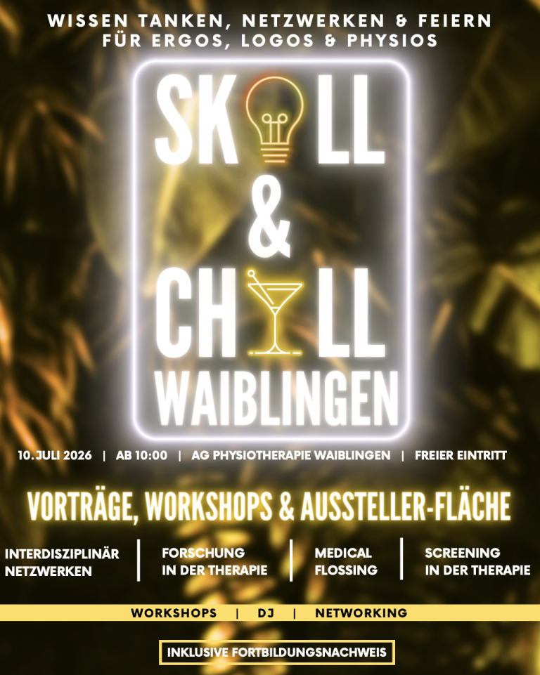 Am 10.07.2026 laden wir dich herzlich zu einem besonderen Fortbildungsevent bei AG Physiotherapie Wabilingen ein. SKILL & CHILL ist das perfekte Event für Ergotherapeut:innen, Logopäd:innen, Physiotherapeut:innen und alle, die sich für innovative Ansätze in der Therapie interessieren.