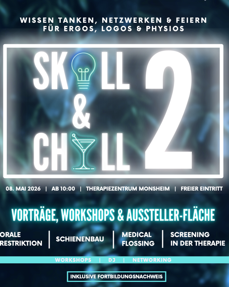 Am 08.05.2026 laden wir dich herzlich zu einem besonderen Fortbildungsevent ins Therapiezentrum Monsheim ein. SKILL & CHILL ist das perfekte Event für Ergotherapeut:innen, Logopäd:innen, Physiotherapeut:innen und alle, die sich für innovative Ansätze in der Therapie interessieren.